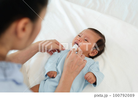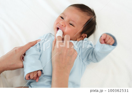 mother using finger to clean newborn baby mouth (tongue and gum) with clean gauze on bed