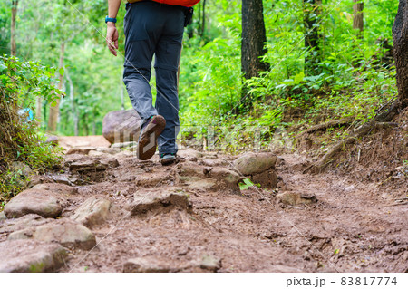 Hiking tourists wearing backpacks outdoors trekking in forest. hiker man with shoe covered in mud taken walking in rain forest. Hike trail