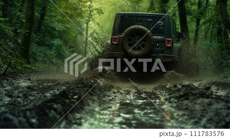 Jeep off-roading through the forest in rainy wet weather through mud and high levels of water run-off from the rain storm disaster