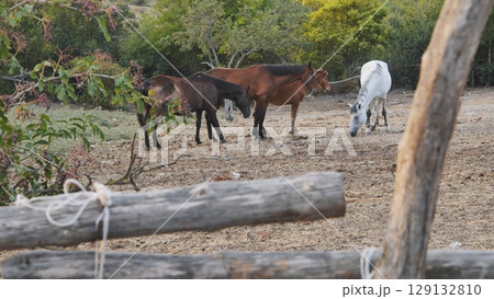 Group of horses enjoying a sunny day in a fenced field, showcasing a peaceful rural scene