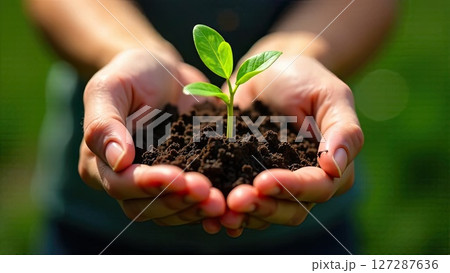 A young green sprout in a handful of earth in the palms of a farmer plants in the ground close-up. AI generated