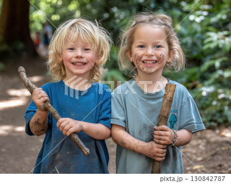 Two happy children with dirty faces holding sticks outdoors in forest, enjoying playful nature exploration with joyful expressions