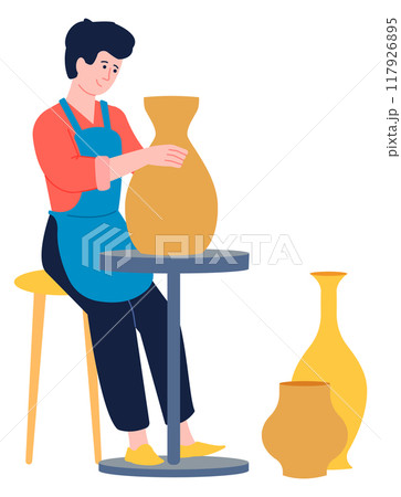 Focused female artisan in apron sitting on bench with pottery wheel and making clay pot