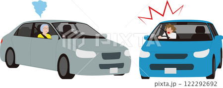 高齢女性のぼんやり運転と衝突しそうな車のイラスト