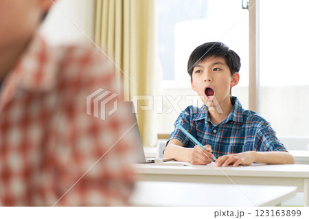 鼻歌を歌いながら勉強する学生の男の子のイラスト素材
