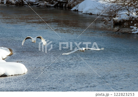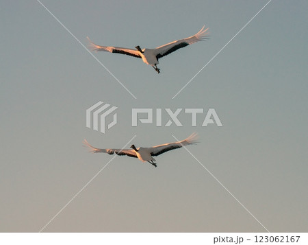 夕陽に向かって美しく飛ぶタンチョウ 菊地牧場