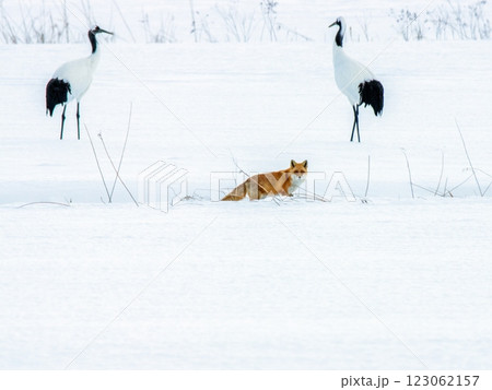 雪よりも白いタンチョウとキツネ 鶴居の雪原