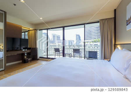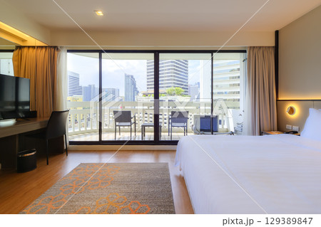 タイ・バンコク中心部の景色を望むバルコニー付きのホテル客室 / Bangkok, Thailand