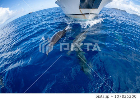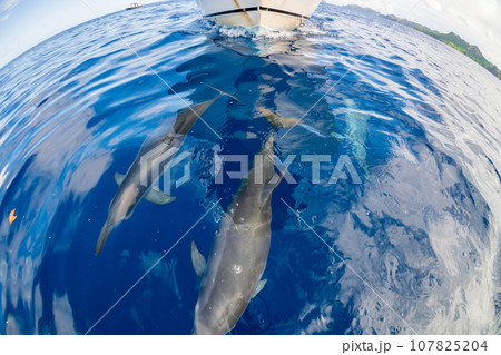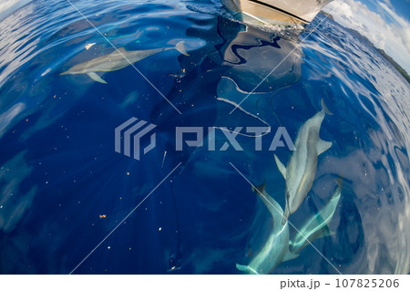 ボートの舳先を泳ぐハシナガイルカ 小笠原の海