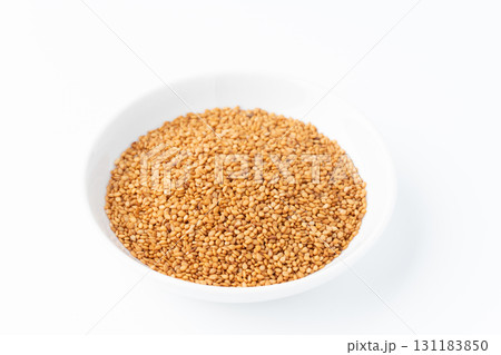 白背景にお皿に入った金ごま(生ごま)