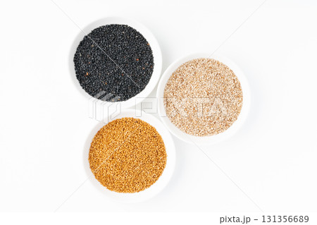白背景にお皿に入れて並べた黒ごまと白ごまと金ごま(生ごま)