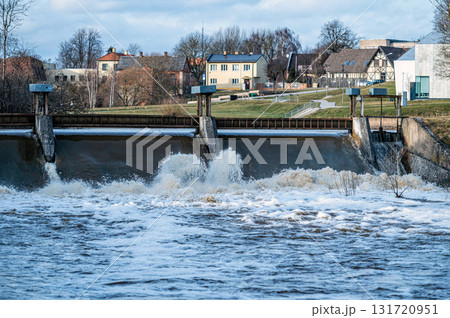 Spring flood water flows over the locks on the Berze river in Dobele, Latvia