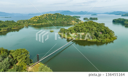 Kaeng Krachan dam with lake view and many green moutain, blue sky background. Kaeng Krachan Dam national park, Phetchaburi province, Thailand in aerial view from drone.