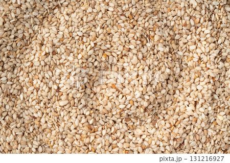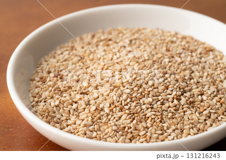 スプーンに載せた白ごま(生ごま)のクローズアップ