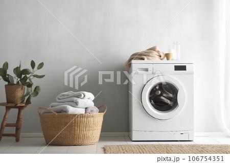 Stylish Laundry room interior. Modern washing machine and laundry basket near white wall indoors, space for text. Bathroom interior copy space. Scandinavian design