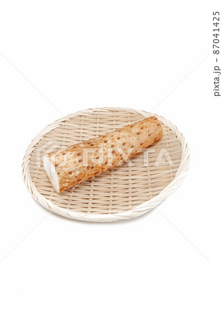 泥を洗ってザルに乗せた長芋【白背景】