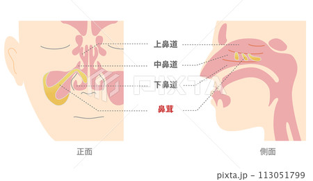 正面と横から見た副鼻腔にポリープ(鼻茸)ができている様子の説明図