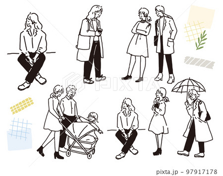 白黒、モノトーン、線画のイラスト(手書き、オシャレ、雑誌、ファッション、可愛い、人物、女の子)