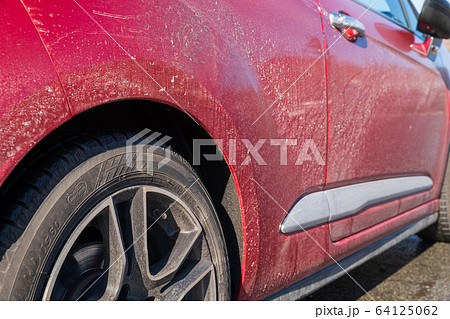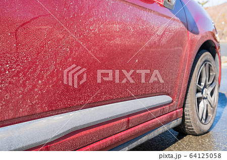 Red car washed in self serve carwash, detail on white soap foam spraying from brush / broom onto side above rear wheel