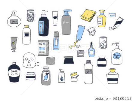 洗面用品の手書きイラストセット ボトルやクリーム、美容用品
