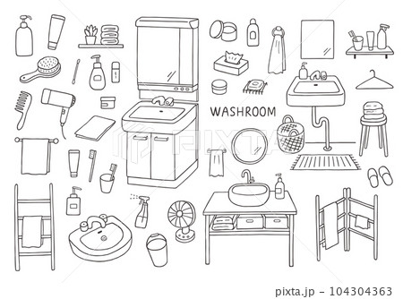 洗面所・水回りにまつわる手描きイラストセット(モノクロ)
