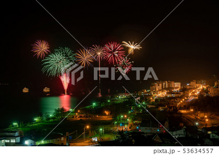北海道 洞爺湖ロングラン花火大会 町並みとともに 比較明合成