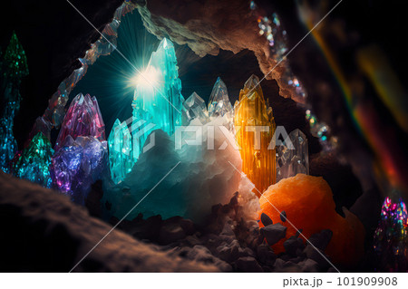 Beautiful wild crystal stalactites and stalagmites in cave. Neural network AI generated art