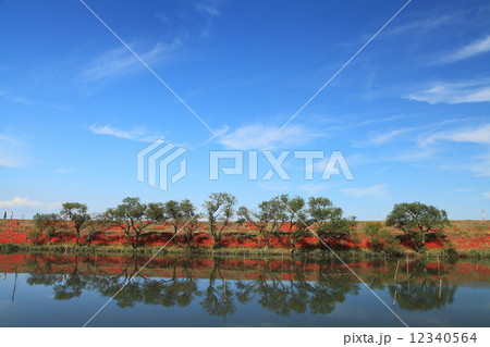 岐阜県海津市南濃町津屋 満開の曼殊沙華(彼岸花)が土手を真っ赤に染める津屋川堤防と水面の反射