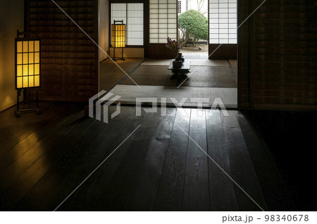 行燈の明かりが点く古民家の板間から見た畳の間と中庭・津山市・伝統的建造物群