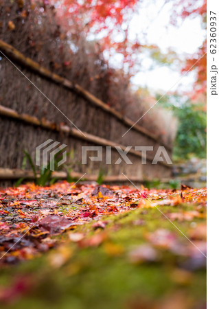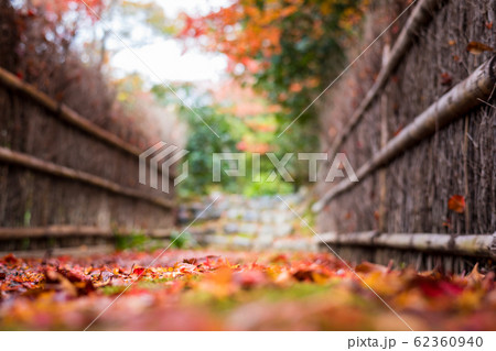 直指庵の時雨、垣根の小道に紅葉と南天の赤い実