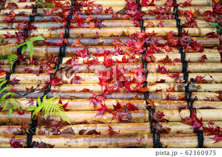 直指庵の秋、竹林の小道に真っ赤な紅葉