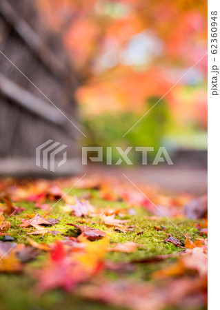 直指庵の時雨、苔むした古い切り株に散る紅葉