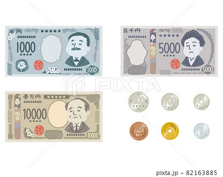 日本の新紙幣のイメージイラスト(10000円札、5000円札、1000円札)