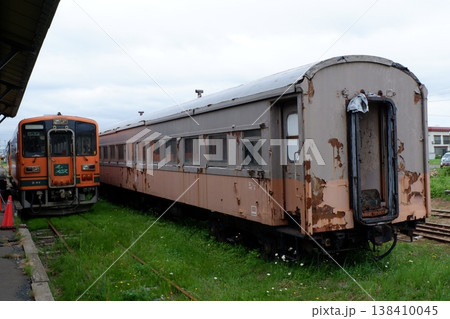 津軽鉄道終着駅の津軽中里駅に停車中の車両と末端部、機回し線