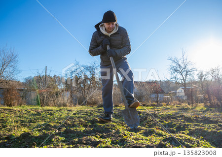 Caucasian man digging ground with shovel. Garden work concept. Preparing soil for planting in springtime. organic farm, agricultural field, farm worker