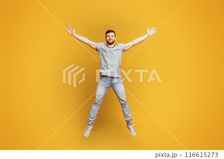 A man leaps energetically into the air, arms outstretched as if reaching for the sky in a moment of intense motion and freedom, yellow background