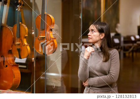 Interested brunette visiting exhibition of medieval musical instruments in museum