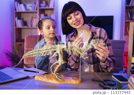 Caucasian mother assemble skeleton of dinosaur with smart cute daughter.