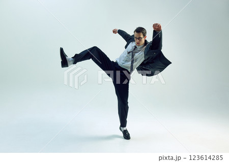 Young businessman dynamically balancing mid-motion, arms spread, body arched against white studio background. Concept of business, emotions