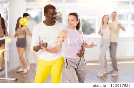 Positive european woman and African american man practicing samba dance moves in pair during group party