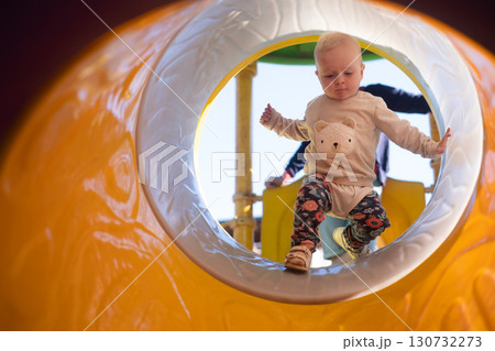 Smiling boy, camper wearing backpack, walking along colorful travel path with tent in background, enjoying outdoor adventure under sunny sky