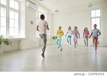 Aerobics conception. Group of female kids practicing athletic exercises together indoors