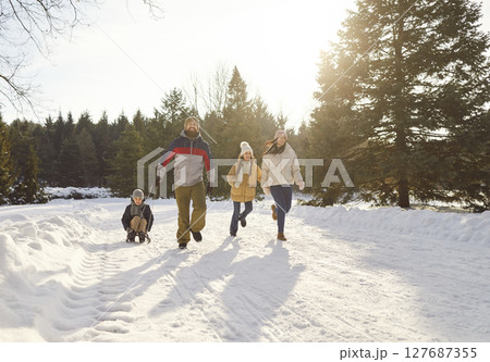Happy family winter outdoor nature activity, running on snow road with sledge, spending weekend