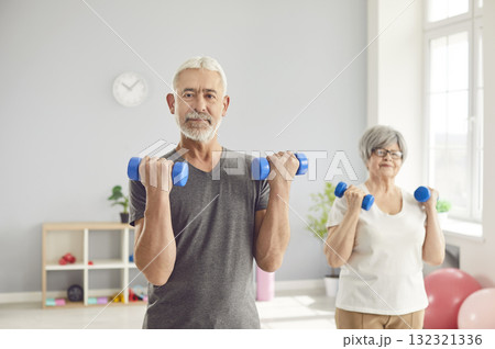Happy Elderly Couple Exercising With Dumbbells In Gym
