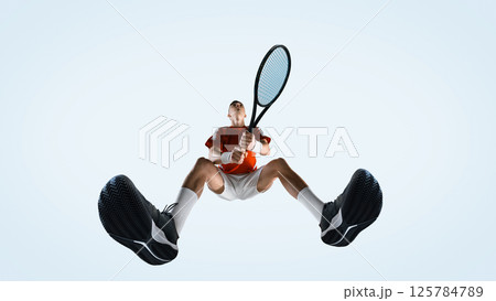 Bottom view of man, tennis player centered with racket held in both hands legs open ready to move against white studio background.
