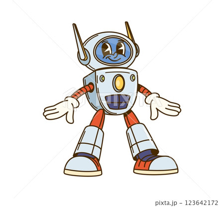 Cartoon groovy robot with antennas character. Futuristic cyborg, artificial intelligence android groovy isolated vector funny character. Chatbot AI droid retro mascot, robotic alien happy personage