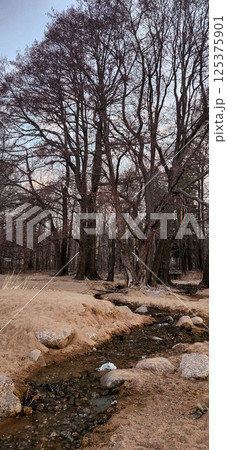 Forest landscape with leafless trees and a small stream running through the terrain. The serene scene captures the calmness of nature in early spring with clear flowing water. Vertical photo.
