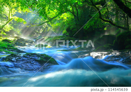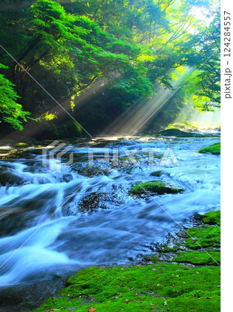 美しい光芒の出る菊池渓谷(熊本県菊池市)