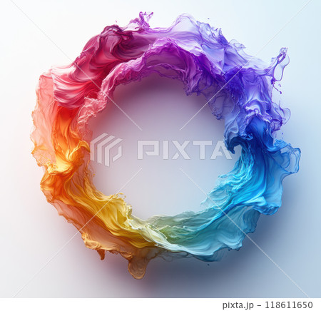 A vibrant circular splash of colorful liquid creates stunning rainbow gradient effect, evoking sense of creativity and fluidity. This artistic representation captures beauty of color blending seamless
