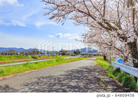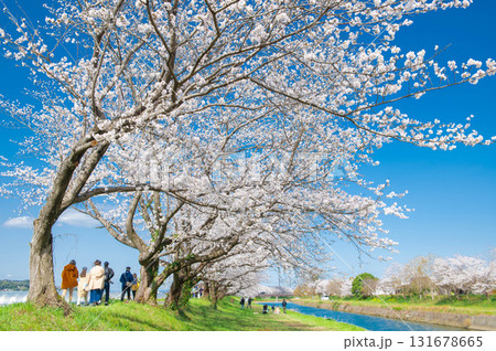 ソメイヨシノの桜の花と菜の花の春のお花見スポット 九州福岡県うきは市浮羽町巨瀬川沿い流川の桜並木